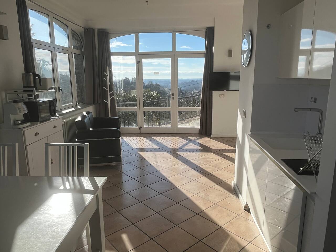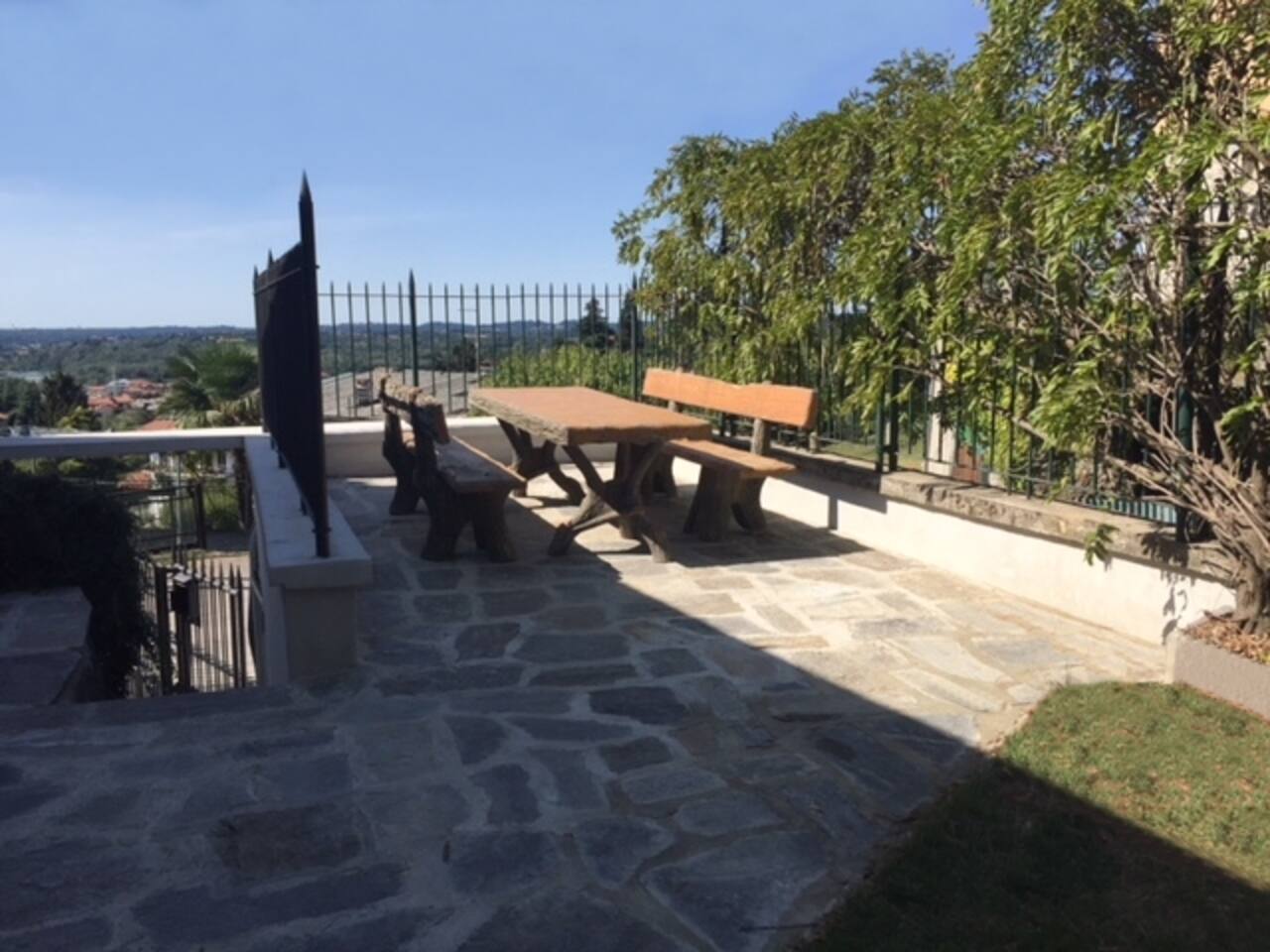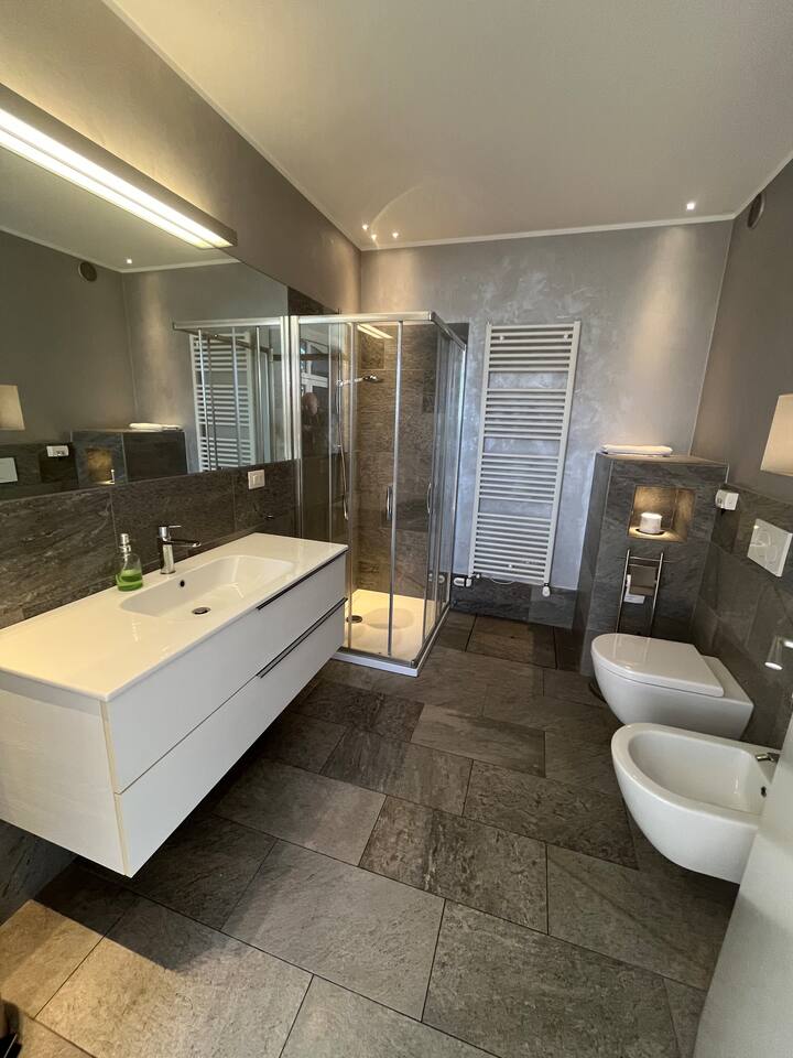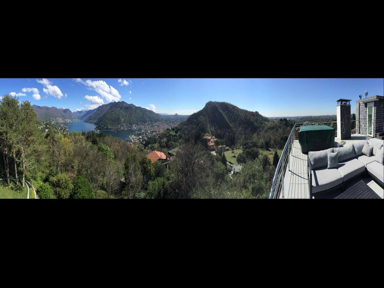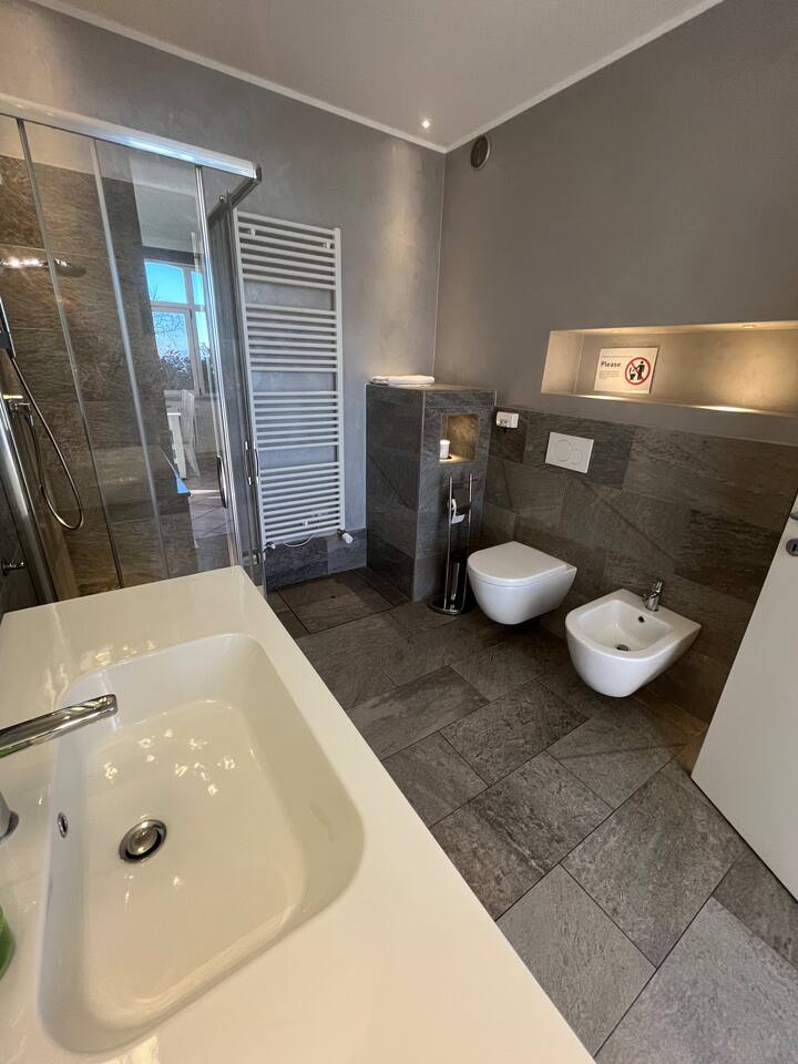 The quiet and modern studio offers a 50 square meter apartment with a spacious living, dining and sleeping area, and a separate big bathroom. The sleeping area, which can be separated by a curtain from the rest of the apartment offers a large double bed (180x200 mm) with two separate mattresses, a nightstand with a bedside lamp and a wardrobe with a clothes rail, hangers and shelves. Here you find also a fireplace which, unfortunately, must not be used due to official regulations. The living area of the studio offers a comfortable leather sofa from where you can watch satellite TV (Astra) with more than 200 channels in various languages. If you adjust the TV, it can also be watched from the bed. The dining area has a massive wooden table (which is one of the few remains from the old villa before renovation), 4 chairs, and a kitchenette which is equipped with an inductive ceramic stove with 2 hotplates, a fridge, a sink, an Italian espresso machine, as well as a basic set of crockery, glasses, cutlery and cooking utensils. The modern and spacious bathroom offers a shower, a washbasin with a sink, a toilet, and a bidet. The studio is bright and has huge windows overlooking the lower-lying garden. To the west, you have a beautiful view overlooking San Fermo and neighboring Switzerland. The city of Como and Lake Como can only be seen from the rooftop terrace. The rooms are usually well-tempered. During fall and winter, they are heated by modern central heating. For the rare occasions in summer when temperatures rise above 25°C you can use a fan. The studio is accessed directly with no steps from the gated yard where you can also park your car. It has also a second entry which leads directly to the idyllic terraced and savaged garden. The whole site consists of more than 2,000 square meters, with most of it being accessible by the guests. Next to the door leading to the garden, there is a small table with two chairs for sitting outside of the studio. Guests of the studio can also exclusively use a terrace which is a few steps away next to the main gate. From here you have also a panoramic view to the west, where you can enjoy the sunset. The highlight is, of course, the rooftop terrace which is accessed through the main house. It is shared with the host and the guests from the penthouse. Most people familiar with Como state, that the roof terrace has the most spectacular view of the city, the lake, and the Spina Verde natural reserve, as it is one of the very few spots where you have a 270° panoramic view with sun all day.