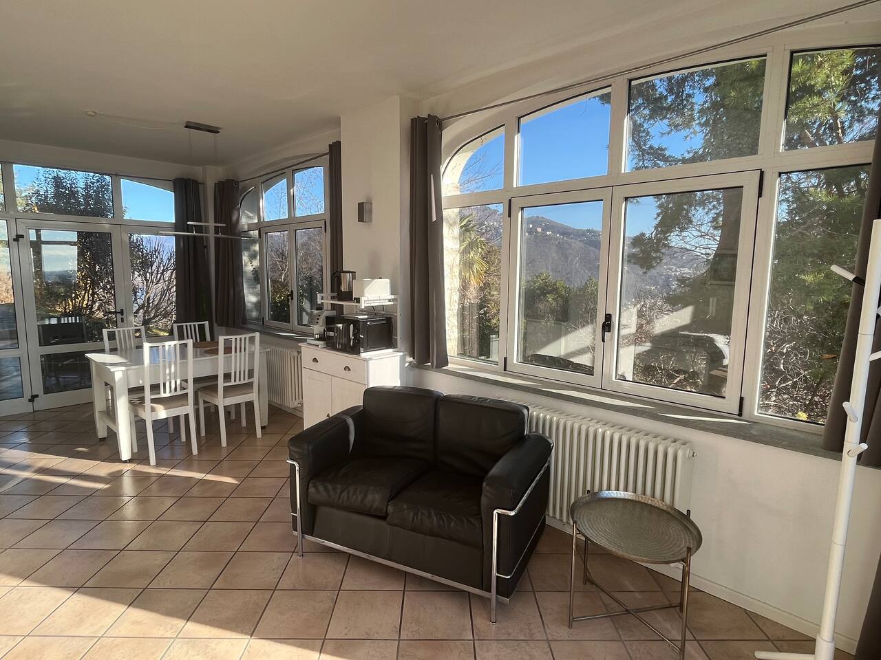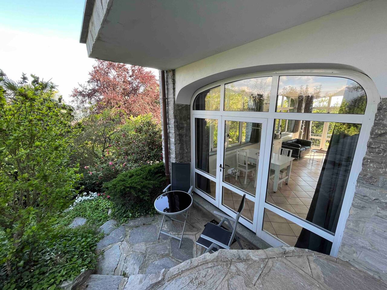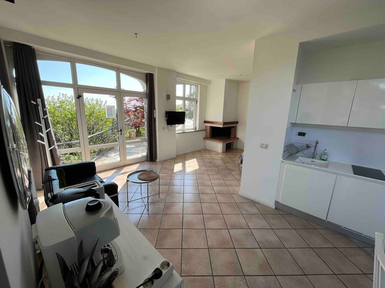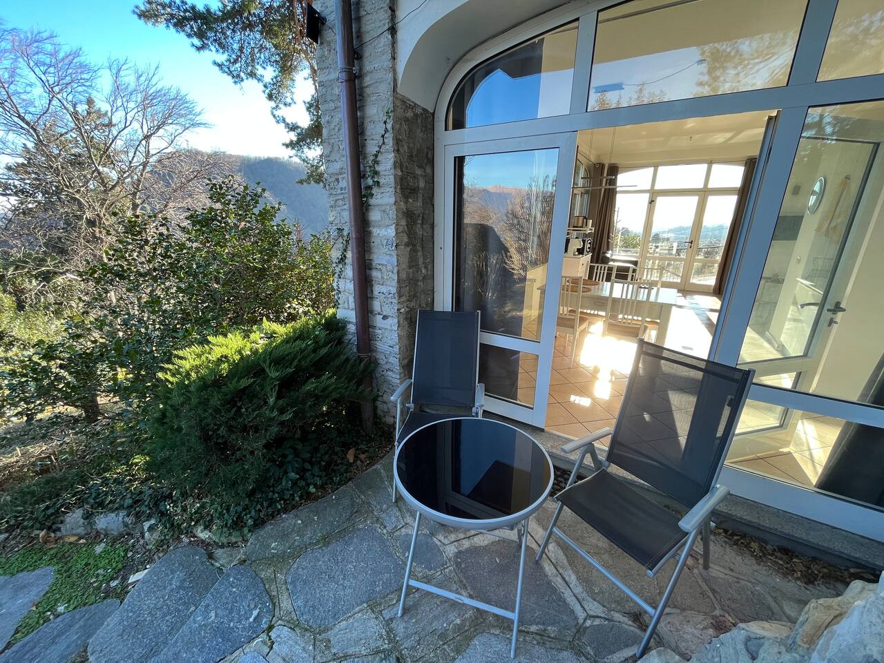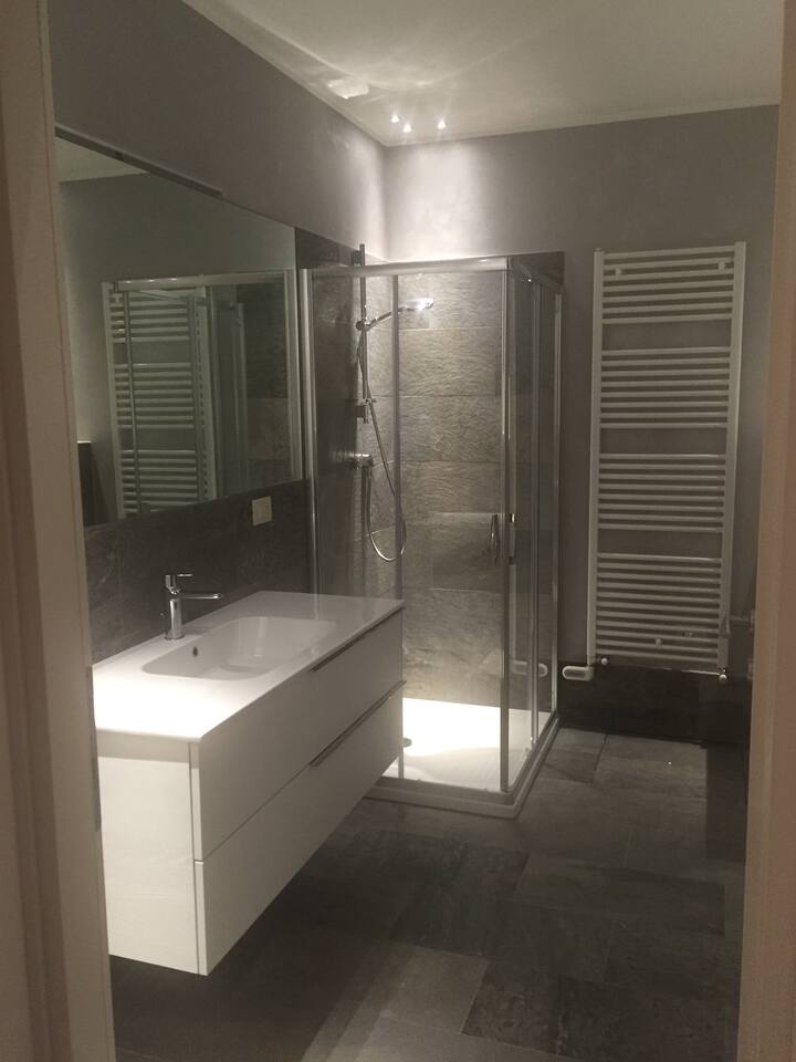 The quiet and modern studio offers a 50 square meter apartment with a spacious living, dining and sleeping area, and a separate big bathroom. The sleeping area, which can be separated by a curtain from the rest of the apartment offers a large double bed (180x200 mm) with two separate mattresses, a nightstand with a bedside lamp and a wardrobe with a clothes rail, hangers and shelves. Here you find also a fireplace which, unfortunately, must not be used due to official regulations. The living area of the studio offers a comfortable leather sofa from where you can watch satellite TV (Astra) with more than 200 channels in various languages. If you adjust the TV, it can also be watched from the bed. The dining area has a massive wooden table (which is one of the few remains from the old villa before renovation), 4 chairs, and a kitchenette which is equipped with an inductive ceramic stove with 2 hotplates, a fridge, a sink, an Italian espresso machine, as well as a basic set of crockery, glasses, cutlery and cooking utensils. The modern and spacious bathroom offers a shower, a washbasin with a sink, a toilet, and a bidet. The studio is bright and has huge windows overlooking the lower-lying garden. To the west, you have a beautiful view overlooking San Fermo and neighboring Switzerland. The city of Como and Lake Como can only be seen from the rooftop terrace. The rooms are usually well-tempered. During fall and winter, they are heated by modern central heating. For the rare occasions in summer when temperatures rise above 25°C you can use a fan. The studio is accessed directly with no steps from the gated yard where you can also park your car. It has also a second entry which leads directly to the idyllic terraced and savaged garden. The whole site consists of more than 2,000 square meters, with most of it being accessible by the guests. Next to the door leading to the garden, there is a small table with two chairs for sitting outside of the studio. Guests of the studio can also exclusively use a terrace which is a few steps away next to the main gate. From here you have also a panoramic view to the west, where you can enjoy the sunset. The highlight is, of course, the rooftop terrace which is accessed through the main house. It is shared with the host and the guests from the penthouse. Most people familiar with Como state, that the roof terrace has the most spectacular view of the city, the lake, and the Spina Verde natural reserve, as it is one of the very few spots where you have a 270° panoramic view with sun all day.