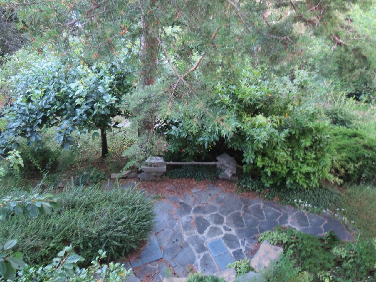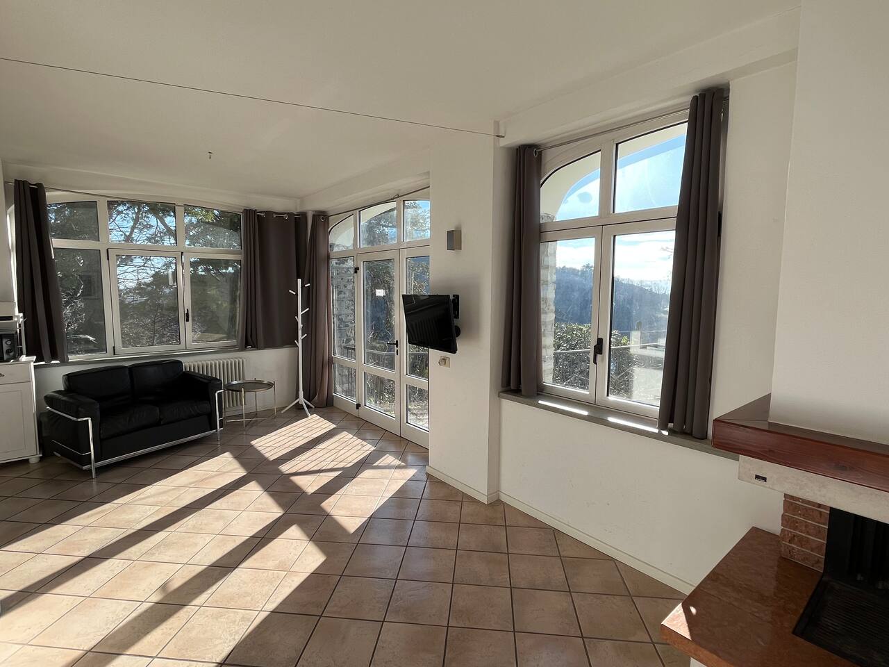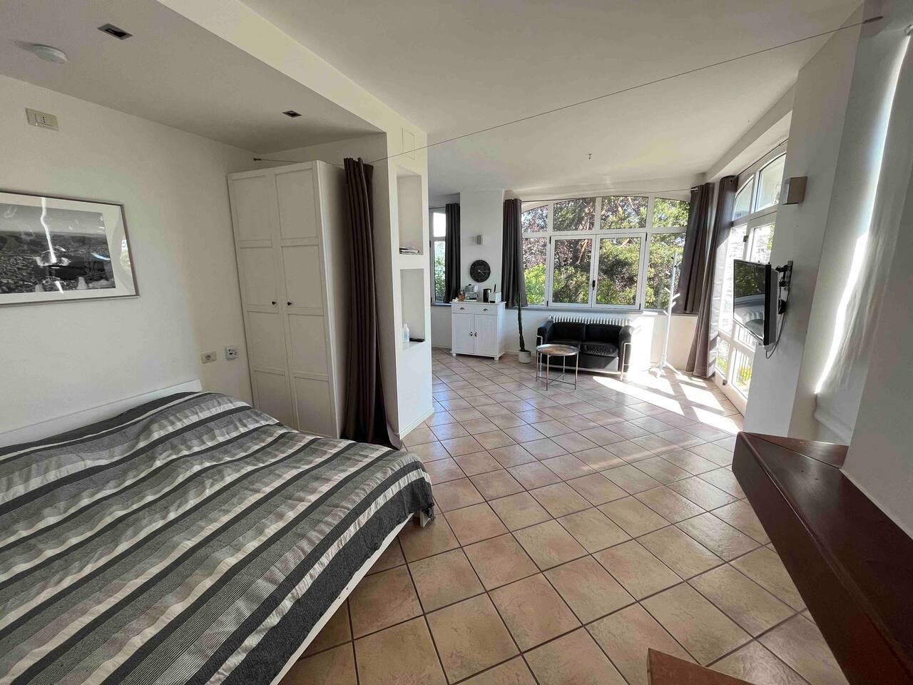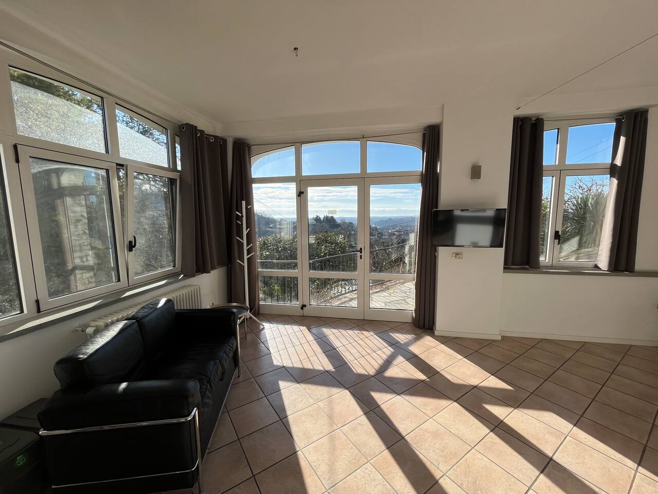 The quiet and modern studio offers a 50 square meter apartment with a spacious living, dining and sleeping area, and a separate big bathroom. The sleeping area, which can be separated by a curtain from the rest of the apartment offers a large double bed (180x200 mm) with two separate mattresses, a nightstand with a bedside lamp and a wardrobe with a clothes rail, hangers and shelves. Here you find also a fireplace which, unfortunately, must not be used due to official regulations. The living area of the studio offers a comfortable leather sofa from where you can watch satellite TV (Astra) with more than 200 channels in various languages. If you adjust the TV, it can also be watched from the bed. The dining area has a massive wooden table (which is one of the few remains from the old villa before renovation), 4 chairs, and a kitchenette which is equipped with an inductive ceramic stove with 2 hotplates, a fridge, a sink, an Italian espresso machine, as well as a basic set of crockery, glasses, cutlery and cooking utensils. The modern and spacious bathroom offers a shower, a washbasin with a sink, a toilet, and a bidet. The studio is bright and has huge windows overlooking the lower-lying garden. To the west, you have a beautiful view overlooking San Fermo and neighboring Switzerland. The city of Como and Lake Como can only be seen from the rooftop terrace. The rooms are usually well-tempered. During fall and winter, they are heated by modern central heating. For the rare occasions in summer when temperatures rise above 25°C you can use a fan. The studio is accessed directly with no steps from the gated yard where you can also park your car. It has also a second entry which leads directly to the idyllic terraced and savaged garden. The whole site consists of more than 2,000 square meters, with most of it being accessible by the guests. Next to the door leading to the garden, there is a small table with two chairs for sitting outside of the studio. Guests of the studio can also exclusively use a terrace which is a few steps away next to the main gate. From here you have also a panoramic view to the west, where you can enjoy the sunset. The highlight is, of course, the rooftop terrace which is accessed through the main house. It is shared with the host and the guests from the penthouse. Most people familiar with Como state, that the roof terrace has the most spectacular view of the city, the lake, and the Spina Verde natural reserve, as it is one of the very few spots where you have a 270° panoramic view with sun all day.